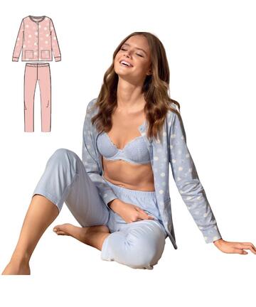 Women's open-fronted homewear jumpsuit in patterned chenille, with pockets and plain-colored trousers with cuffs. Sizes: S - M - L - XL and in the colors Natural and Pink SPRING SUMMER LINE