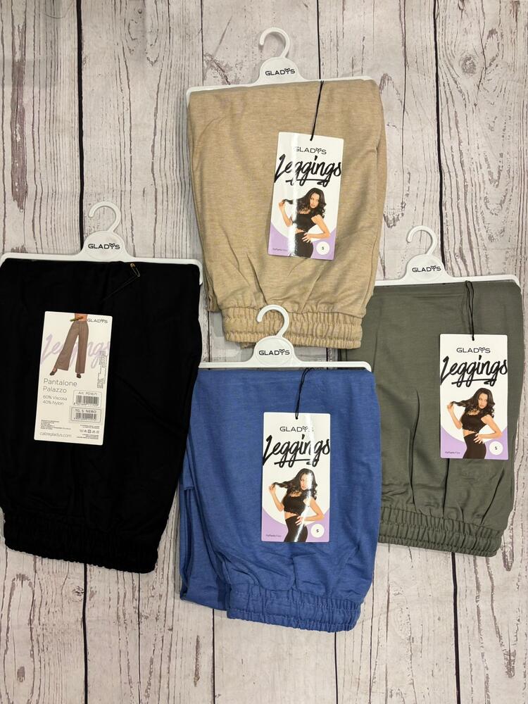 Pantalone da donna in morbida viscosa con gamba ampia a palazzo, elastico in vita con coulisse.